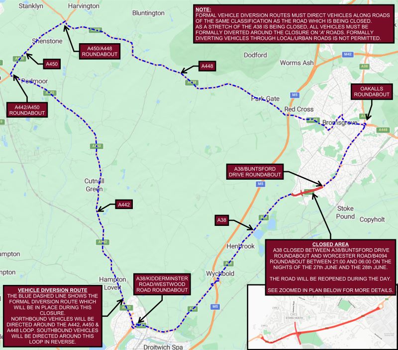 As part of Scheme B improvement works, the next phase of construction will require a temporary closure of the A38 Redditch Road between Hanbury Turn and Buntsford Drive Roundabout.