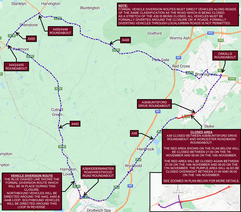 | A38 Redditch Road (Buntsford Roundabout to Morrisons Roundabout) | B | 29 to 31 March 2026 |