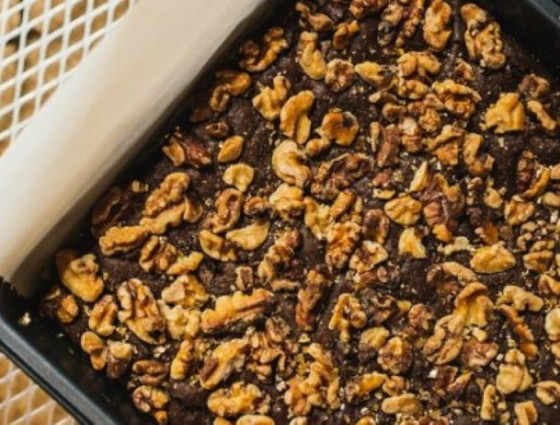 4. Roughly chop and stir in the remaining chocolate and walnuts. Pour the mixture into the prepared tin, spreading it out evenly, then place into the oven for 20 to 25 minutes, or until cooked on the outside, but still gooey in the middle.