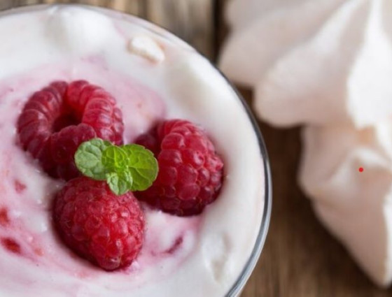 2. Swirl the raspberries through the yoghurt.
