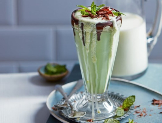 - Chill in the fridge to set. Blend the mint chocolate ice cream with the milk, then whisk in a little green gel food colour, if you like. Pour into the glass and top with a few mint leaves and a sprinkling of dark chocolate shavings.