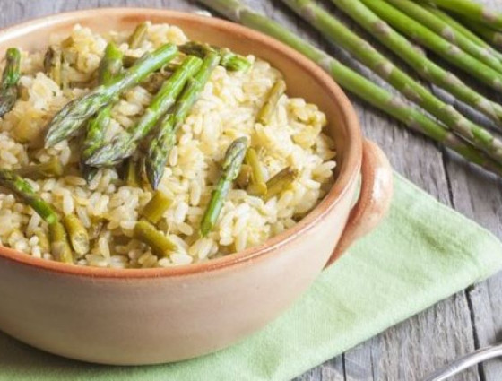Pearl barley risotto with asparagus, peas and spinach
