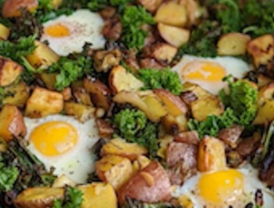 Potato, kale and egg breakfast tray bake