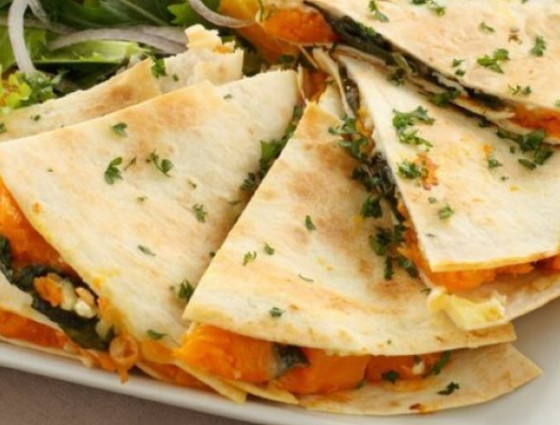 Pumpkin, black bean and red onion quesadillas