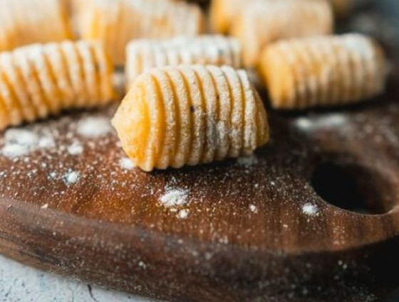 4. Divide into tablespoon size balls and roll into roughly 2 and half centimetre sausages on a floured surface. Cut the dough into 1 cm pillows and roll over a fork to leave ridges. Place the pillows onto a floured baking tray until needed.