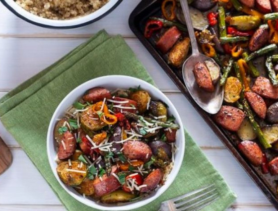 4. Squeeze the raw chorizo out of its skin, crumbling it into a roasting tray with 1 tablespoon of olive oil.