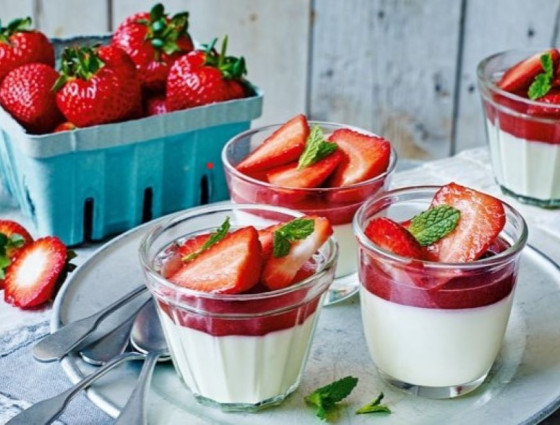 Layers of sweet, summery goodness – creamy panna cotta topped with homemade strawberry jelly, fresh berries & mint. This pud is an ideal way to round off an alfresco dinner and you can use any in season soft fruits in the jelly.
