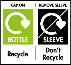 Recycle – Bottle Cap On – Don’t Remove Sleeve: Quite often you will need to separate packaging before it can be recycled or thrown away. This label can be seen on packaging where a sleeve or film is simple to remove from the main packaging |