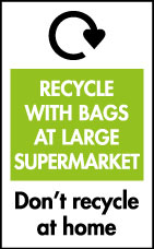 Recycle with bags at large supermarkets – Don’t recycle at home: This label can be seen on plastic wrapping like bread bags, chocolate wrappers and crisp packets. This can be recycled and is collected at specialised collection points at your local supermarket |