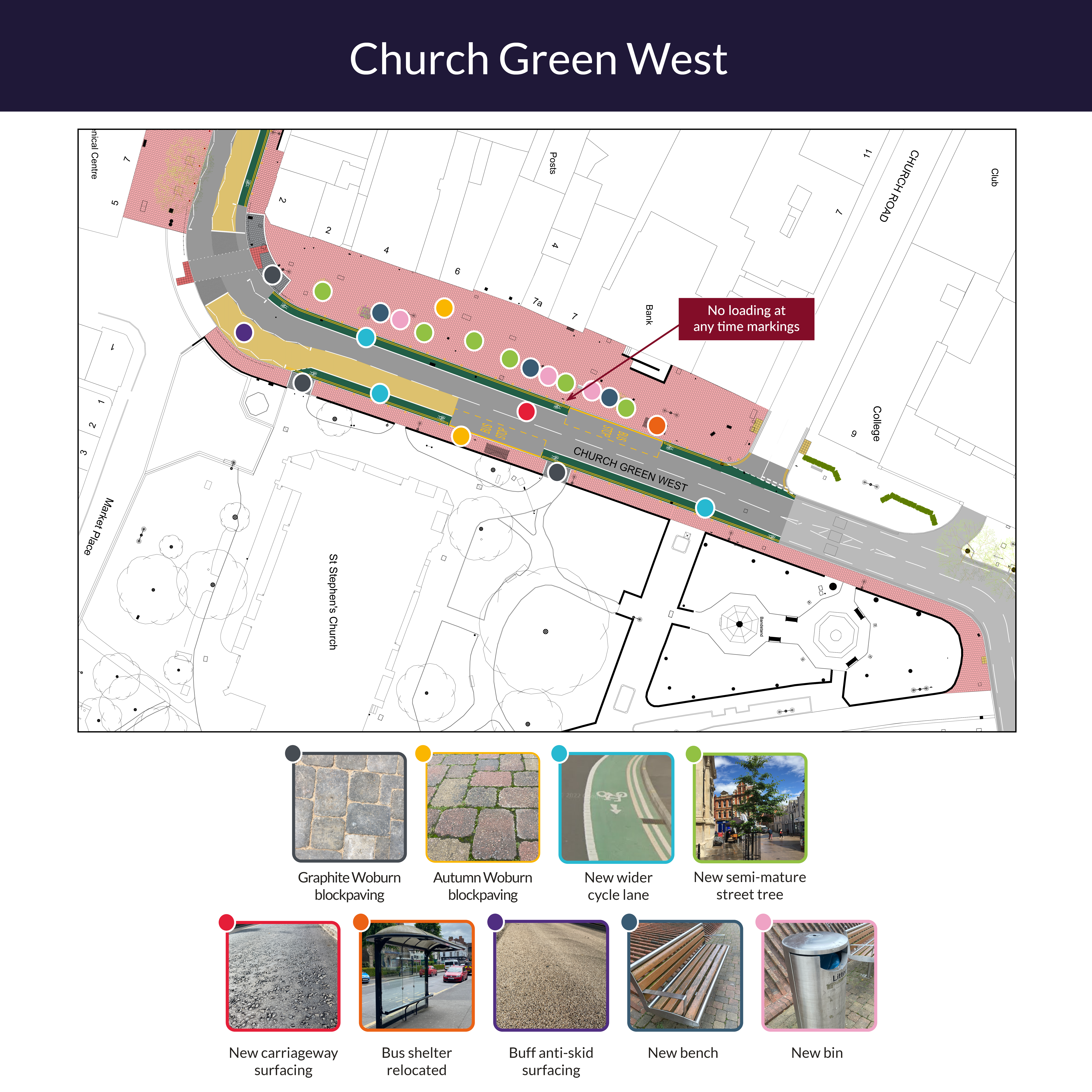 The next phase of works will see the introduction of wider cycle lanes, resurfaced footways, new cycle parking, bins, and benches. New loading and disabled parking bays will also be provided on Unicorn Hill and the top half of the existing taxi rank will be available for limited waiting parking during the day. To enhance safety for everyone, loading will only be permissible from the new loading bay.